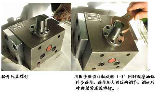 自調(diào)式同步閥調(diào)整方法    a、同步誤差調(diào)整:略松六個(gè)螺釘用專用扳手小幅度旋轉(zhuǎn)上蓋,觀察油缸速度差可邊動(dòng)邊調(diào)(只能空載調(diào)整)。帶...